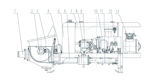 1.出料口 2.攪拌機(jī)構(gòu) 3.料斗 4.機(jī)架 5.液壓油箱 6.泵送系統(tǒng) 7.機(jī)罩總成 8.潤滑系統(tǒng) 9.動(dòng)力系統(tǒng) 10.防暴電動(dòng)機(jī) 11.液壓系統(tǒng) 12.水冷卻部件 13.電器總成