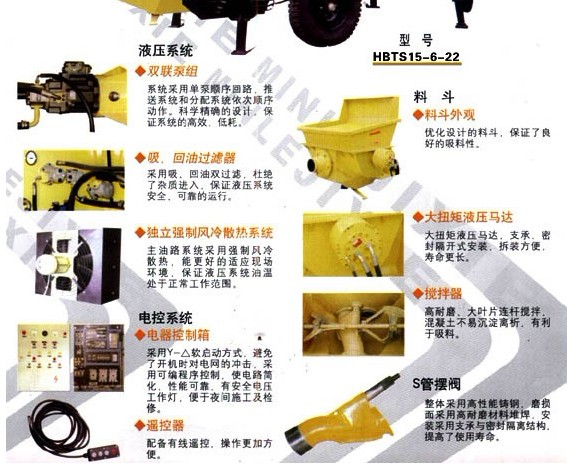 細(xì)石混凝土泵配件有:主油缸、砼缸、三相異步電機(jī)、主油泵、料斗、S管、電配柜、手動(dòng)油泵、活塞;00#鋰基脂;常用的電器配件(按鈕天關(guān)、行程天關(guān)、斷路器、接線端子、變壓器等)、液壓液管;46#液壓油;眼睛板、切割環(huán)(當(dāng)設(shè)備打到5000方以上就可以備了)等等。
